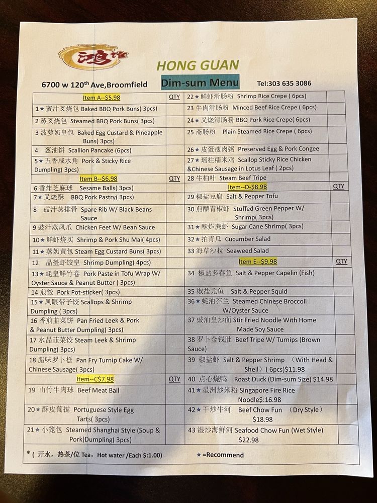 Introducing Hong Guan - a Chinese restaurant in Broomfield, CO offering traditional Cantonese dim sum. Customers praise the quality and variety of dim sum, with standout items like chicken feet and hot pots. The ambiance is classic Chinese with prompt and attentive service. Pricing is competitive, making it a popular spot for dim sum lunch or dinner. Some customers suggest adding more American Chinese dishes for variety. While there were some menu items unavailable, overall, the dining experience was enjoyable. Hong Guan's vast selection and unique entrees make it a favorite among locals. Don't miss trying their recommended dishes and combining vinegar, soy sauce, and chili oil for dipping. Despite some room for improvement, Hong Guan's potential for growth and success in the area is promising.